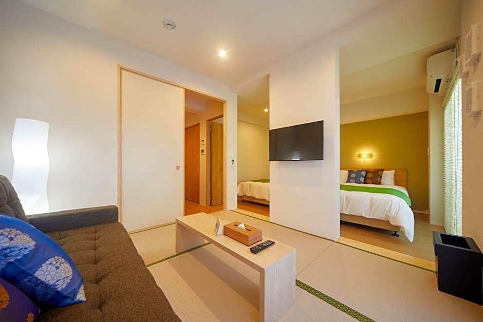 This apartment is consisted of of 1 living room, 1 separate bedroom and 1 bathroom with a bath and free toiletries. Guests can make meals in the kitchen that is fitted with a stovetop, a refrigerator, kitchenware and a microwave. The apartment features tatami floors, a seating area with a flat-screen TV, air conditioning, a washing machine as well as city views. The unit offers 4 beds.